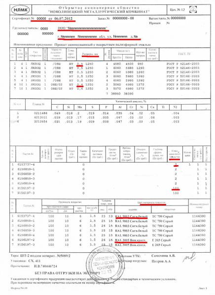 Разбираемся с сертификатом, узнаем о маркировке. Сертификат поможет дать ответы на вопросы - толщина стального проката, класс оцинковки, марка и цвет полимерного покрытия. Ниже приведена копия сертификата, выданного Новолипецким Металлургическим Комбинатом. Для наглядности, красным подчеркнута необходимая информация – номер и дата выдачи сертификата, наименование и адрес получателя стального проката, толщина проката (в графе размеры), класс цинкового покрытия, цвет полимерного покрытия. Если мы покупаем в 2012 году металлочерепицу или профлист 0,4 мм толщиной с цинковым покрытием 100 г/м2 и полимерным покрытием полиэстер вино-красного цвета, либо 0,5 мм толщиной с цинковым покрытием 2-го класса от 140 г/м2 и полимерным покрытием полиэстер белого цвета, и нам показывают такой сертификат, то с большой долей вероятности мы получаем именно то, что покупаем. Если же мы покупаем нечто иное, либо сертификат старый (более 1,5 лет), следовательно, нас осознанно, либо неосознанно вводят в заблуждение (продавец может перепутать сертификаты или просто не разбираться в продукции). Сертификаты на импортное сырье несколько отличаются по форме, но разобраться в них можно по аналогии с представленным образцом. Качественная продукция, как правило, маркируется производителем с обратной стороны листа. Маркировка наносится с определенным шагом, поэтому при заказе промаркированными могут оказаться не все листы, но большинство будет промаркировано. Низкокачественный товар сознательно не маркируется - производителям не выгодно афишировать факты подобного производства. Посмотрите маркировку или спросите продавца о маркировке листа. Маркировка – гарантия качества. В качестве примера - маркированная продукция известной финской фирмы Ruukki – надпись "Ruukki Original Quality" с обратной стороны листа. Маркируется не только сырье. Надежные производители металлочерепицы тоже маркируют свою продукцию, декларируя тем самым свою ответственность за высокое качество продукции и достоверность ее характеристик. |