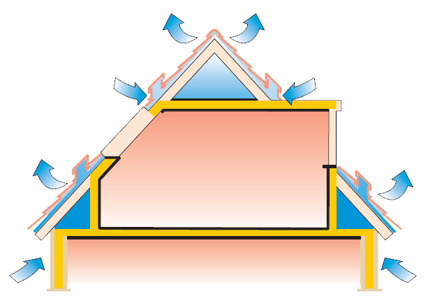 Поэтому циркуляция воздуха (не важно - холодного или тёплого) помогает удалить из крыши избыточную влагу. На этой крыше утеплитель уложен вплотную к гидроизоляционной плёнке с низкой паропроницаемостью, поэтому даже при наличии выходного отверстия на коньке движения воздуха нет и образуется конденсат.