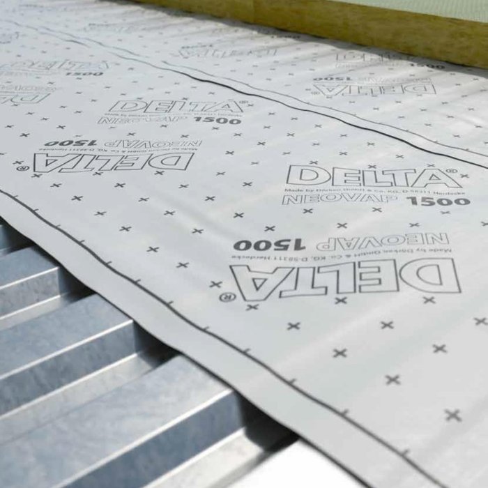 Двухслойная пленка из алюминиевой фольги с покрытием из LDPE. Самоклеящий слой данной пароизоляционной пленки не содержит битума, выполнен из полимерного материала. Данная пароизоляционная пленка применяется в конструкциях плоских и скатных крыш, имеющих несущее основание из профилированных стальных листов (профнастила). Она безопасна при перемещении кровельщиков при производстве кровельных работ. Полностью самоклеящаяся нижняя сторона обеспечивает полную фиксацию на основании без использования сквозного крепежа. Не требуется пригруз во время укладки на плоской кровле. DELTA®-NEOVAP 1500 не имеет аналогов в ассортименте российских и европейских производителей. Технические характеристики новинки: