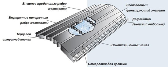 Специальный фильтрующий элемент обеспечит полноценную вентиляцию в подкровельном пространстве и защитит от атмосферных осадков.