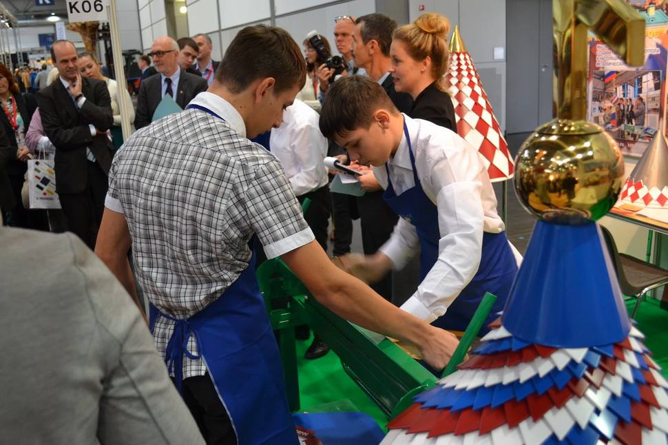 На выставке наши парни продемонстрировали в три раза уменьшенную копию этой башни. А как известно, чем меньше башня, тем труднее её сделать, так как точность должна быть выше и юные кровельщики продемонстрировали своё виртуозное мастерство.