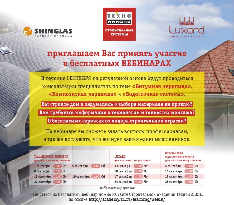 Весь сентябрь технические специалисты из «ТехноНИКОЛЬ» проводят серию вебинаров, где дают консультации по устройству кровли из битумной черепицы SHINGLAS, композитной черепицы Luxard и устновке пластиковой водосточной системы Verat.