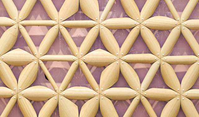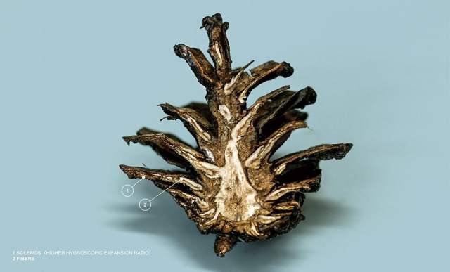 Чешуя шишек сосны состоят из двух слоев: внешней кроющей оболочки и внутренней семенной. Попадая во влажную среду, внешняя оболочка впитывает воду и расширяется, образуя защитный панцирь. Взяв за принцип эту особенность, Чен создал трехслойный материал на основе ткани, тонкой пленки и шпона. Попадая в водную среду, волокна шпона расширяются перпендикулярно структуре, удлиняя и изгибая материал, подобно чешуе шишек.