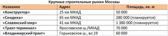 около 25 строительных рынков, суммарная площадь которых составляет примерно 800 тыс. м². Самые крупные расположены около МКАД - «Славянский мир», «Синдика», «Тракт-Терминал» и «Каширский двор». Сейчас они превратились из стихийных развалов в оборудованные крытые центры с банкоматами, парковками, кафе и другими преимуществами торговых комплексов. Несмотря на сложную экономическую ситуацию, доля свободных площадей на строительных рынках не превышает 7%.