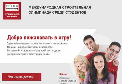 Будущие строители могут стать обладателями компьютера или Iphone 6 и получить приглашение на работу в крупную компанию, успешно пройдя испытания в компьютерной игре. С 1 по 30 ноября компания ТехноНИКОЛЬ проведет Первую Международную Строительную Олимпиаду в сети интернет. Принять в ней участие могут студенты очных отделений всех курсов строительного направления подготовки. Уникальность Олимпиады в том, что она реализовывается на базе интерактивной онлайн игры ТехноМатрица.