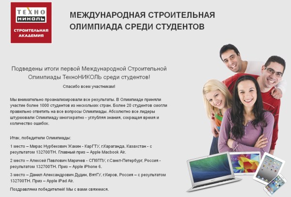 Пьедестал почёта заняли Мирас Жакин из Караганды, Данил Дудин из Кирова и Алексей Маричев из Петербурга, занявшие первое, второе и третье место соответственно. Победителем вручили ценные призы – гаджеты Apple. Помимо этого их пригласили на собеседование в крупную компанию. Всем студентам, активно принимавшим участие в мероприятии, вручили сертификаты и свидетельства Строительной Академии ТехноНИКОЛЬ. С теми, кто добился наиболее высоких результатов в определённом регионе, обсудят