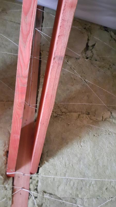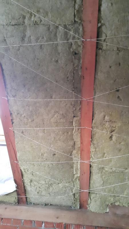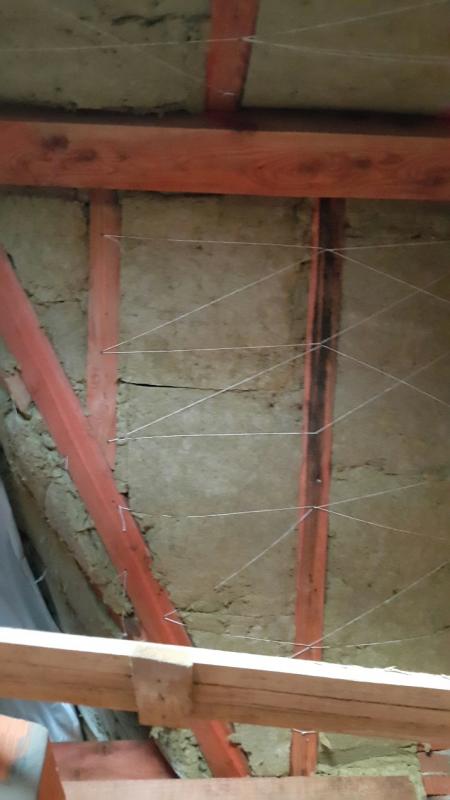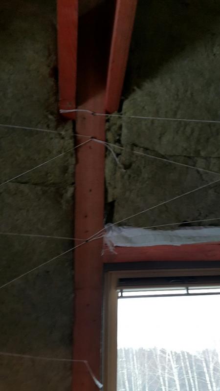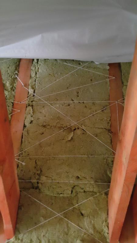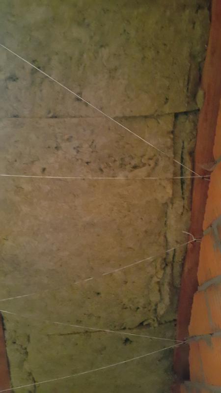 Далее, рабочие сняли обрешетку, а пароизоляция изоспан тоже оказалась в плесени . Пароизоляцию тоже было решено заменить. Когда сняли пароизоляцию, то я сильно удивился. За процессом монтажа кровельного пирога я не следил , понадеялся на спецов фирмы. Мин вата ЛАЙТ БАТТС СКАНДИК -от ROCKWOOL размером 50 мм уложенные в 4 слоя хотя можно было использовать два по 100мм, но это не главное . Утеплитель начал вываливается и рабочие привезли его ниточками . А вываливаетая он так как нарезанный мелкими кусочками , где то зазор что можно просунуть руку, где то подтыкано скомкаными кусочками.