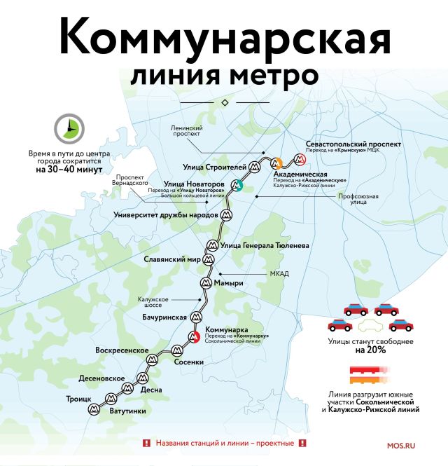 Скоро линии столичной подземки протянут и в Троицк. В 2024 - 2025 г.г. планируется завершить строительство Коммунарской линии. Метро в шаговой доступности получат более 400 тысяч человек. Когда откроются новые станции, время в пути до центра столицы сократится на 30–50 минут. Будут разгружены дороги - Калужское шоссе, Ленинский проспект и Профсоюзная улица и близь лежащие линии метрополитена - Сокольническая и Калужско-Рижская. Протяженность Коммунарской линии составит 37 километров. Она соединит станцию Московского центрального кольца (МЦК) Крымская с Троицком и пройдет по территории районов Гагаринский, Обручевский, Ломоносовский, Котловка, Донской, Нагорный, Академический, Проспект Вернадского, Коньково и Теплый Стан, затем вдоль Калужского шоссе через поселение Мосрентген и поселок Коммунарка. На ней будет 16 станций. Кроме МЦК, можно будет пересесть на «Академическую» Калужско-Рижской, «Улицу Новаторов» Большой кольцевой и «Коммунарку» Сокольнической линии. Последняя станция "Троицк" станет конечной и расположится на Октябрьском проспекте. Этот вариант выбрали сами жители голосованием.