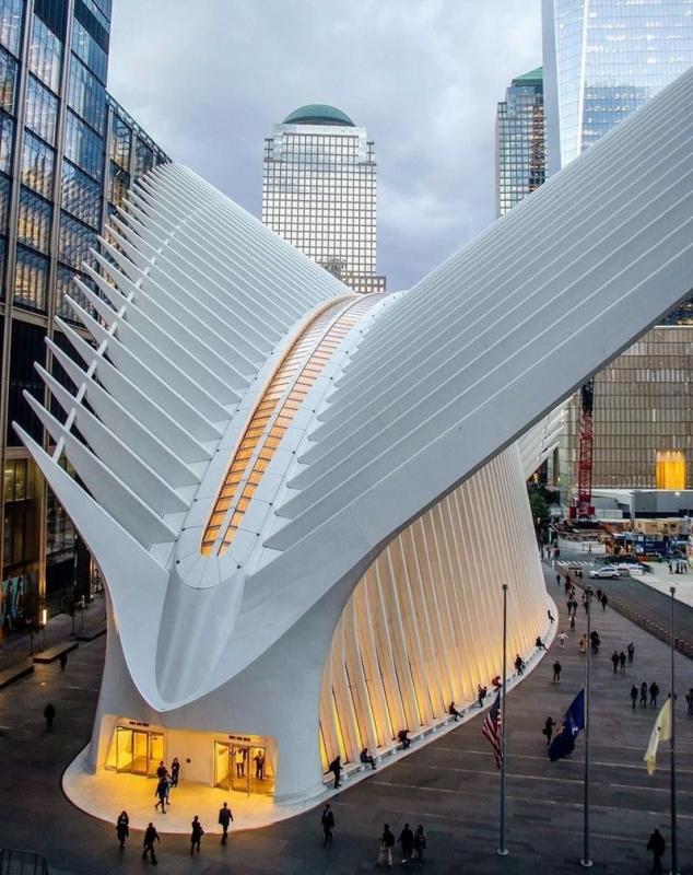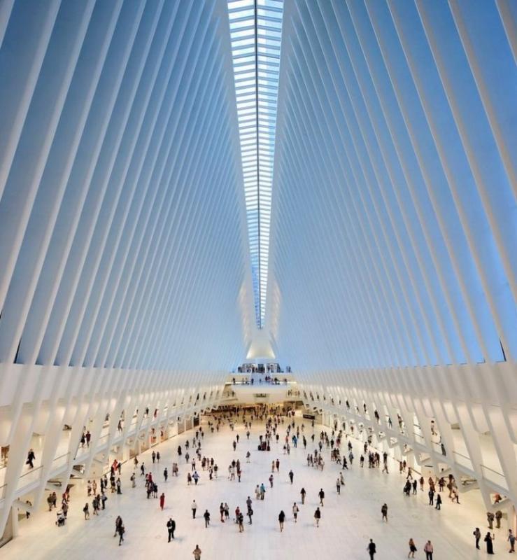 Oculus - это удивительное творение архитектора Сантьяго Калатравы, который был нанят в качестве архитектора для этого проекта в 2004г. Бюджет проекта составил 2 миллиарда долларов. В 2008 году начато строительство нового вокзала. Во время строительства пришлось внести изменения в проект, так как первоначально предусматривалось создание здания, напоминающего птицу. Крышу – крылья планировалось сделать раздвижными. Но из-за ограничений бюджета дизайн вокзала изменили, чтобы исключить механизм открывания – закрывания крыши. Здание раскинуло свои крылья среди комплекса зданий Всемирного торгового центра в квартале Нижнего Манхэттена 3 марта 2016 года. Oculus является не только транспортным узлом, но и архитектурной изюминкой Нью-Йорка. Самая необычная часть этого комплекса – пешеходный подземный переход. Его длина составляет 180 метров. Он соединяет две разные части Всемирного Торгового Центра. Это самый дорогой подземный переход в мире - его возведение стоило 225 миллионов долларов. В здании вокзала расположен торговый центр Westfield. В нем расположены магазины и бутики известных торговых марок. Здесь располагается популярный гастрономический рынок Eataly. На нем можно попробовать традиционную итальянскую пиццу или пасту, купить качественные итальянские продукты. В Oculus легко добраться из разных точек Нью-Йорка, чтобы прогуляться, совершить покупки и пофотографироваться.