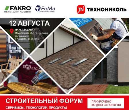 В программе форума: - Презентации продуктов и сервисов ТЕХНОНИКОЛЬ, FAKRO, БИОФА - Мастер-классы и конкурсы от ТЕХНОНИКОЛЬ, FAKRO, БИОФА Завершится форум вручением призов и проведением интеллектуальной игры "квиз". Начало в 10:30 Адрес: ПАРК «ЗАБАВА» Ярославская обл., д. Белкино Координаты: 57.452016, 39.751253 Участие бесплатно. Необходима предварительная регистрация по ссылке https://clck.ru/sU7t6