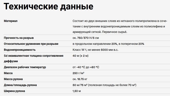 3. Стойкий к механическим повреждениям благодаря армированию и внешним защитным слоям из нетканого материала (Поверхностная масса - 250 г/м²). Может применяться в качестве разделительного слоя для металлических фальцевых и штучных кровель.