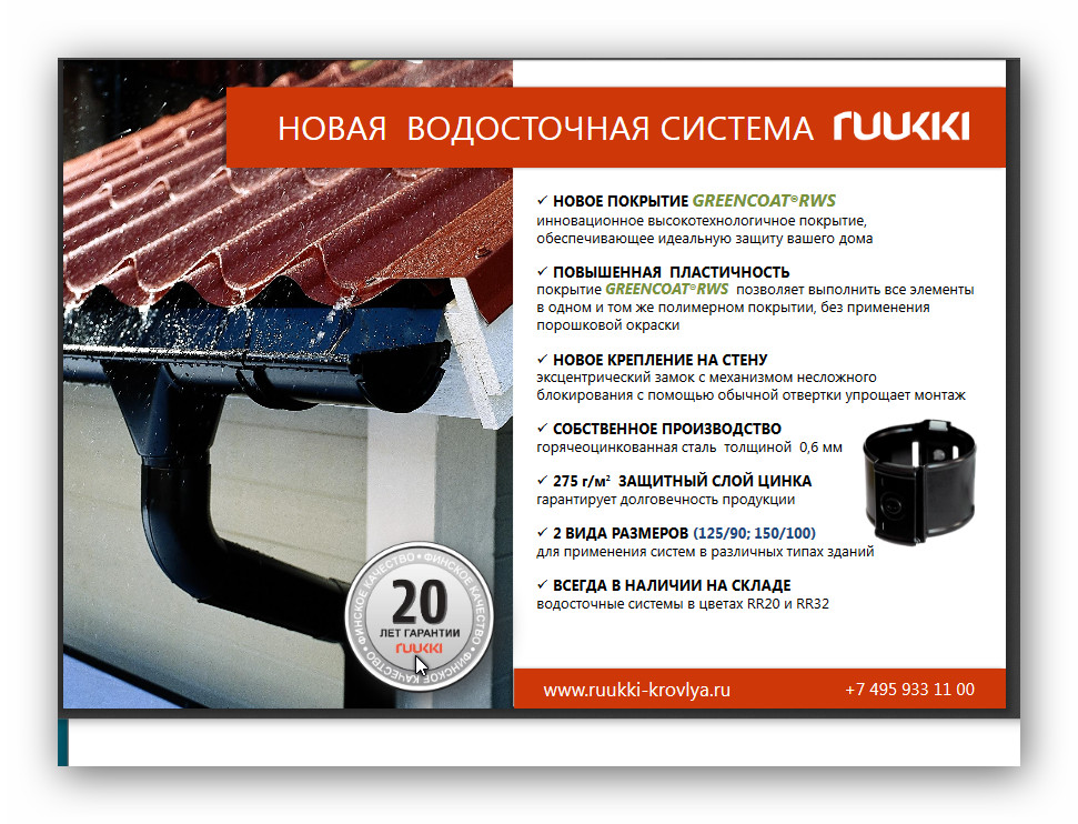 Компания RUKKI выпустила в свет новую водосточную систему. Система имеет все те же 2 вида размеров. Новое крепление на стену. Новое покрытие с повышенной пластичностью.