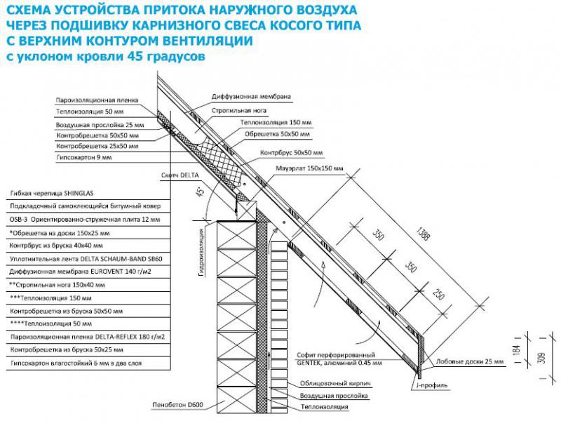 А каким образом воздух будет попадать в подкровельное пространство,если вы вглухую зашьете лобовыми досками вентпродух (по рисунку так кажется)?Через перфорированные панели подшивки свеса,а дальше через мембрану в "надмембранное" пространство?Уверены,что проницаемости мембраны хватит для того,чтоб обеспечить необходимый приток воздуха?Или планируется оборвать мембрану,не доводя до края свеса,по рецепту Раннилы 80-х годов?Так тот рецепт вроде как признали "лжеучением и антимарксистской ересью"?
