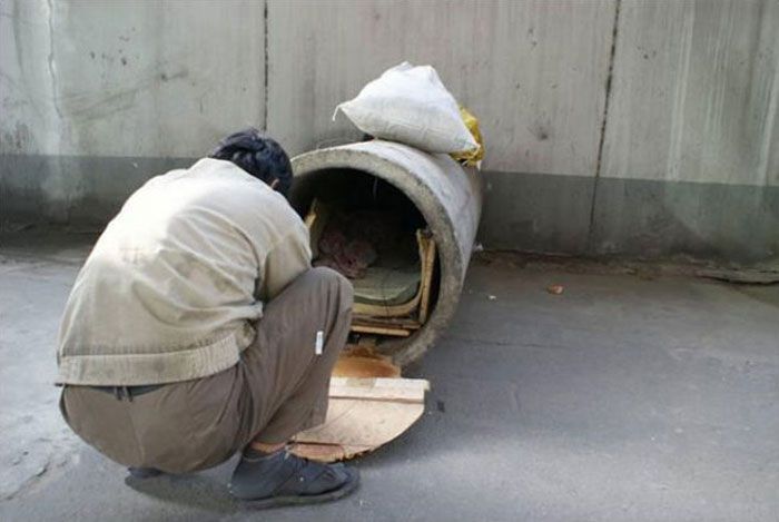 Китайский гражданин по имени Мао Ли целый год прожил в бетонной трубе длиной почти два метра.Внутри он сделал деревянный «пол» и дверь. Из домашнего скарба лишь подушка да покрывало.Год он так прожил, пока власти обратили на него внимание. «У нас не должно быть людей, живущих в трубах» сказали они пообещали выдать ему квартиру.