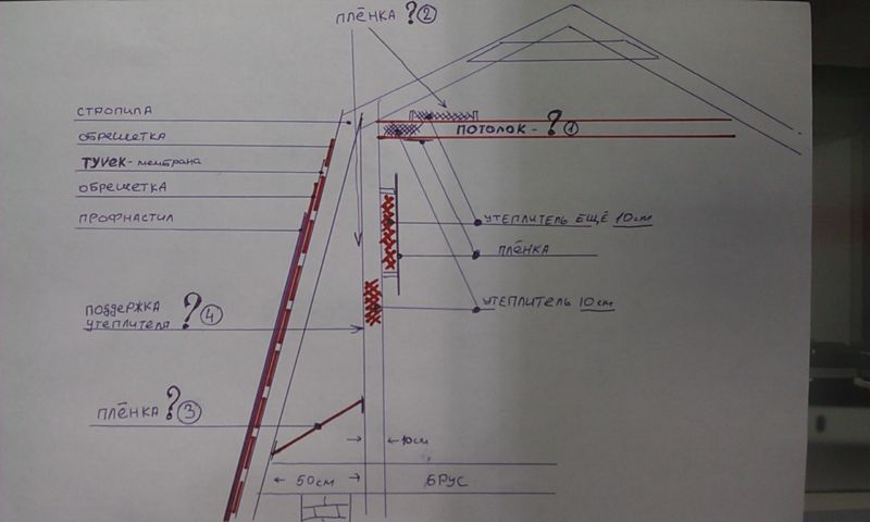 На рисунке пример моего представления правильной последовательности пирога!!! Как я понял покрывать химией доску в моей ситуации -не желательно!!! Диффузионная пленка (изоспан)-подойдет?(или что то получше) Так и не понял для потолочной балки 100*50 доска подойдет или нет??? (её попробую закрепить и к стойке и к стропилам!!! ""2.Нужно, ремарку про ТУВЕК не понял.."" -не понял что конкретно непонятно? |