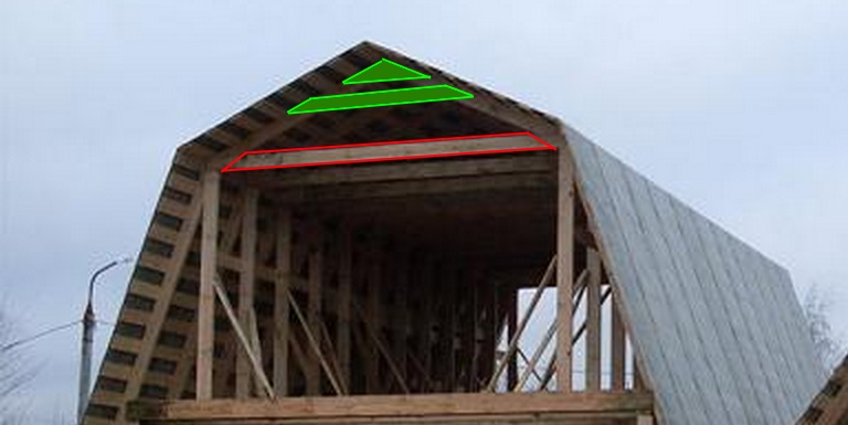 на фото если спилить красную доску и укрепить там где зеленым отмечено, крыша не сложится? ЗЫ. Фото не мое, спилить нужно для того чтобы сделать потолок выше. |