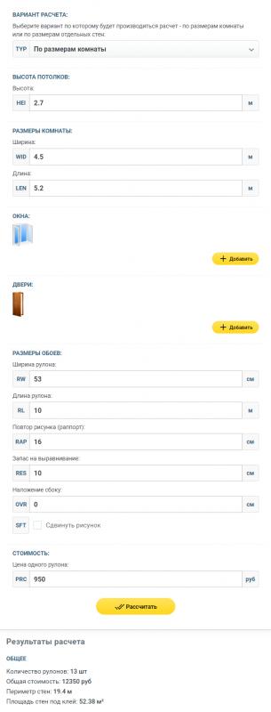 На днях появился новый калькулятор внутренних отделочных работ – расчет обоев. https://kalk.pro/finish/wallpaper/ Он отличается от других тем, что расчет производится по разворотам рулона, т.е. если остаточная длина рулона будет меньше высоты потолка, берется новый рулон, а остатки старого используются для более мелких элементов, например, под окно. У других же, в большинстве случаев, расчет производится по площади, т.е. как будто разворачивается один бесконечный рулон. В этом случае программа покажет меньший расход, потому что подразумевает, что обои вы будете клеить рулон за рулоном, даже если шов придется на середину стены. Но это недопустимо, поэтому используется методика расчета по разворотам рулона. Если есть какие-нибудь предложения или замечания, пожалуйста, свяжитесь со мной! |
