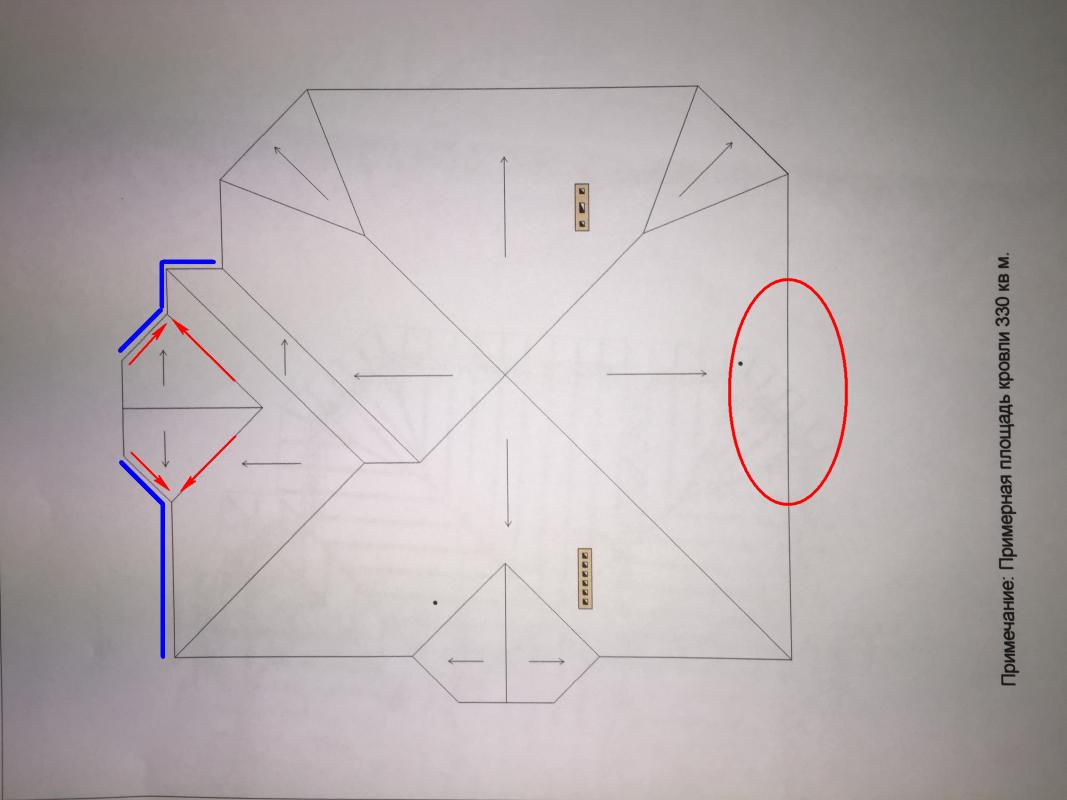 Судя по этому рисунку - .... Там фронтон с двумя ендовами и карнизом в общей плоскости.....т.е.вот так А "засады" на мой взгляд в эркерах...... Там 2 варианта спуска воды - либо по желобу (синий контур) либо по кровле (красные стрелки)... Вариант 1. Если по желобу - то он приходит во внутренний угол под наклоном. Таких углов в стандартной комплектации нет - т.е. либо под заказ, либо на коленке.... На коленке для такого дома не фонтан. А под заказ ?? Там угол в трёх плоскостях и по идее его надо паять, а если паять, то из меди (желоба с полимерным покрытием не паяются) , а если из меди то вся система медная.... Можно конечно паять из пластика, но опять же пластик в данный дом не вписывается..... (это естественно личное мнение) Вариант 2. По красным стрелкам - тогда по сути - это схождение 2х ендов (ну или скажем "полутора" Т.е. для этих узлов исполнитель должен обладать достаточно хорошими навыками фальцевой техники (лучше двойного фальца) В этих местах и каменщики ещё постараться должны, поскольку там разновысокая кладка с сопряжением двух плоскостей по фасаду + ендовы не в угол... и её (кладку) надо достаточно точно отловить, поскольку фасад идёт сразу в отделку.... |