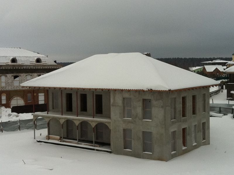 Зимой 6 дней...летом 3-4 дня на дом такой же конфигурации (высота 8 м по свесам и 11м конёк)