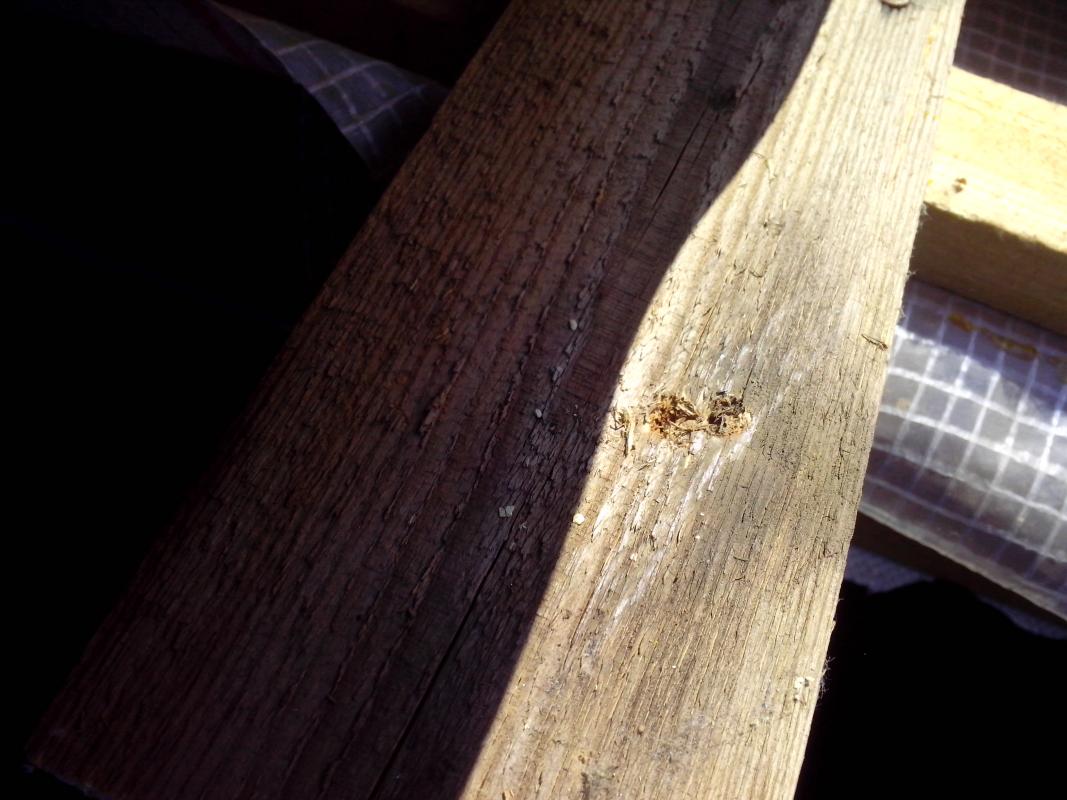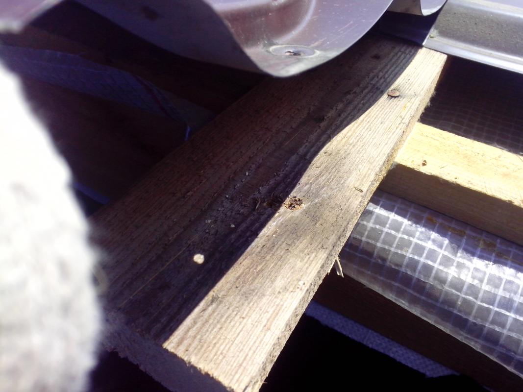 Справедливости ради стоит отметить , что саморезы вкрученные по нормали к скату чувствуют себя замечательно , а вот те что соединяют два листа (как на фото) , или же под углом отличным от нормального провоцируют подтекание . В случае соединения на стыке листов даже перпендикулярно вкрученные саморезы не спасли от того что за счёт капилярного подсоса между листами оказывалась вода , а уплотнительная шайба как известно только наверху , результат выше.... Диаметр повреждения древесины 5-7 мм , глубина также 5-7 мм. Кстати о применении "болгарки" , на данной кровле все листы резались именно ею, коррозия только непосредственно на линие реза Я всё-таки прихожу к мнению , что опасно для покрытия именно стружка , попавшая на лист и повредившая ЛКП.