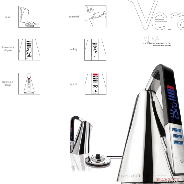 Инновационный дизайн Bugatti Vera не только дань моде, но и результат ряда исследований, в ходе которых было доказано, что коническая форма корпуса способствует значительной экономии электроэнергии. А в сочетании с дисковым нагревательным элементом, это позволяет чайнику Bugatti Vera снизить энергопотребление на 25%. В тоже время скорость нагрева воды при этом только увеличивается. Чайник Bugatti Vera имеет удобную подставку с центральным контактом, то есть вы можете поворачивать его на 360 градусов и ставить на базу из любого положения. Крышка открывается от легкого нажатия, а под крышкой установлен съемный моющийся фильтр, чтобы в чашку лилась только чистая вода. Ручка чайника – это еще и своеобразная панель управления с дисплеем и сенсорными кнопками. Встроенные датчики определяют температуру и уровень воды, что отображается на дисплее. Таймер позволит вскипятить воду прямо к началу чаепития, и не пропустить обед, даже если вы сильно заняты, но заранее установили нужное время. Чайник Bugatti Vera автоматически нагреет воду и подаст звуковой сигнал. Вы можете также регулировать температуру нагрева воды: от 45оС до 100оС. Это особенно важно, если вы предпочитаете зеленый чай или чай из трав, который теряет полезные свойства, если заварен крутым кипятком. В качестве приятного бонуса вы получаете электронные часы. |