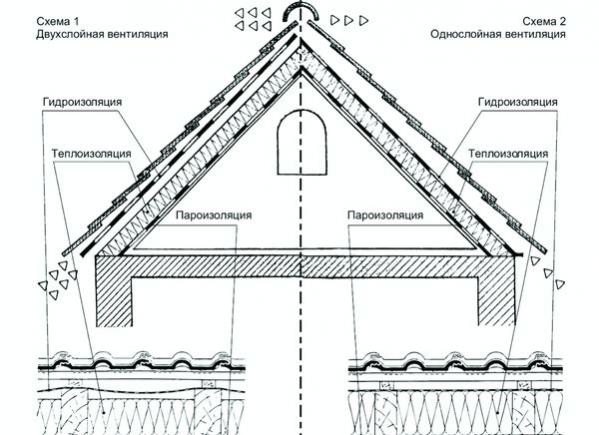 В зависимости от принятого материала подкровельной гидроизоляции различают два типа вентиляции: двухслойная (схема 1) и однослойная (схема 2). Чаще всего крышу вентилируют по схеме 1.