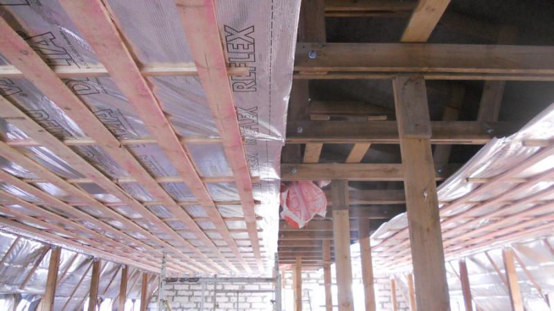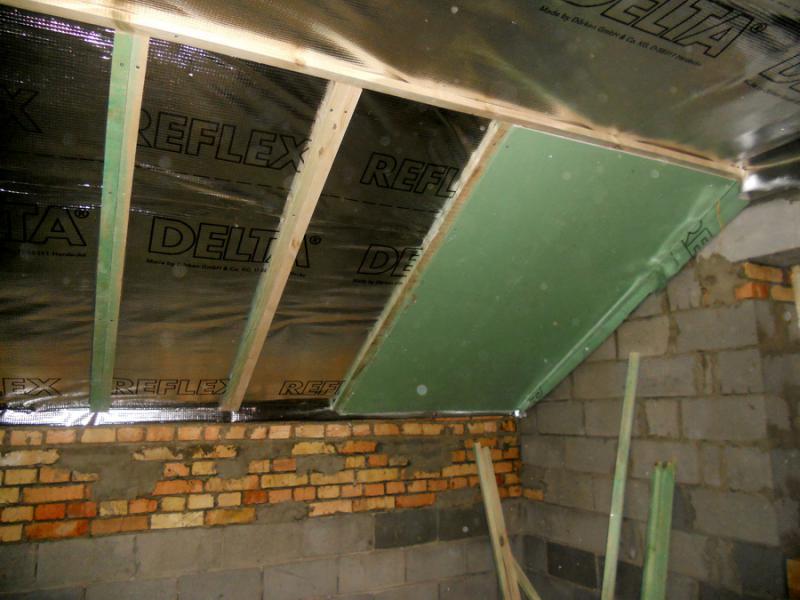 1. Нахлесты пленок проклеиваются скотчем! 2. Пирог утепления изнутри мансарды мы делаем так: парик, рейка 40х25 мм, разреженная обрешетка, 2 слоя влагостойкого гипсокартона. Фото монтажа выкладывал ранее - еще раз выкладываю! 3. Под рейку NAGELDICHT не используем, только для дифки и только под керамику и ЦПЧ (в остальных случаях ни-ни). ПС. Рейки строганные по 8 т.р./м3. |