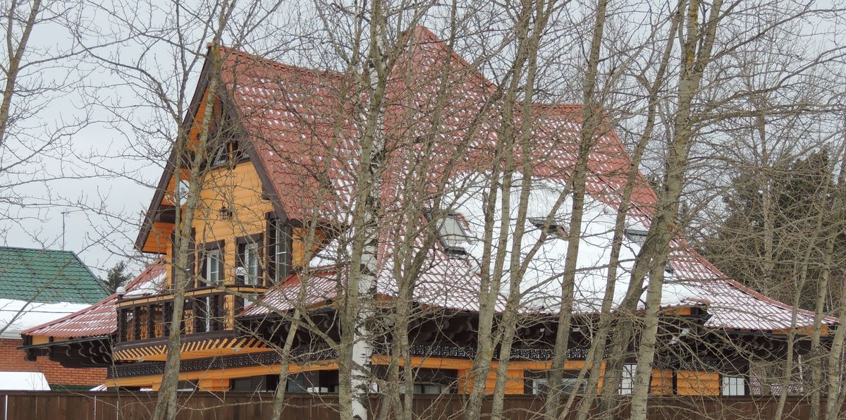 Заснял вчера интересную крышу в восточном стиле. Кровля - металлочерепица. Извиняюсь за качество, снимал с дороги...