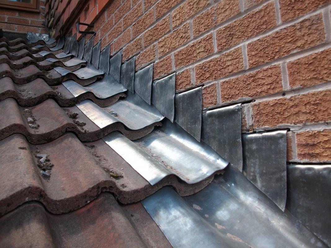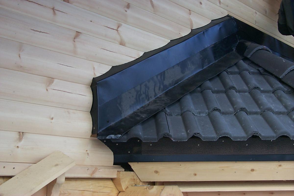 Лично делал пару таких примыканий на бревне 250 мм, но фото, к сожалению, не осталось. В приложении - фото свинцового примыкания к кирпичной стене, но принцип одинаковый. Также фото с одного из моих объектов: черепица примыкала к бревну/блокхаусу при помощи отвратительной ленты Wa....lеx, но сверху обязательно закрывалась планкой, заведённой в прорезанный под углом паз.