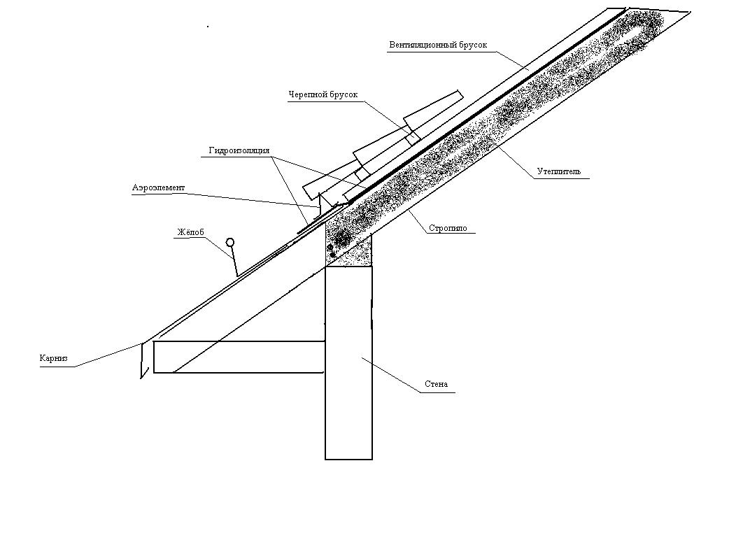 Должен извинится за не совсем точную свою формулировку. Действительно завести гидроизоляцию в настенный жёлоб можно только в случае черепичного рядового покрытия и это проще простого. Странно что ни кто об этом не догадывался. В случае фальцевой кровли или битумного гонта гидроизоляцию заводят не в жёлоб, а на карниз. Хотя настенные желоба на битумке я наблюдал только один раз. При сплошной обрешётке гидроизоляцию кладут всегда сверху обрешётки. А то что иногда вешают с низу является вертозащитой. Хотя многие считают её гидроизоляцией. Если же обрешётка разряженная то гидроизоляцию можно повесить вот так. Хотя конечно ни кто так не делает. Поскольку сам факт разряженной обрешётки свидетельствует о желании максимально удешевить и упростить кровлю. |