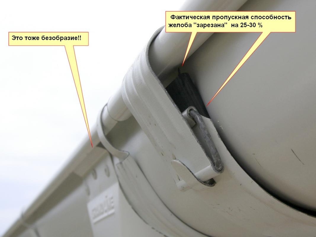 По водосточке - по фотографиям ощущение, что при монтаже задрали лицевой край желоба высоко. Завтра выложим фотографии примерно похожей сборки - все состыковано плотно и хорошо держится даже без заклепок. Воронку с 2012 года совсем не меняли.