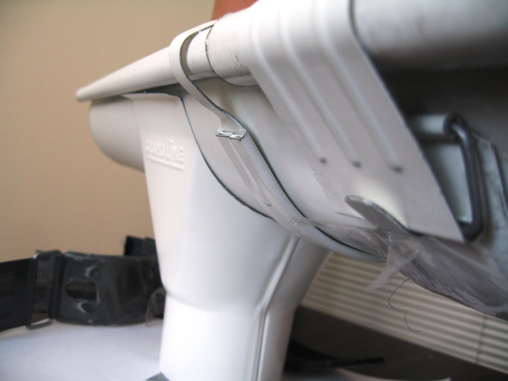 Я не могу сказать на 100% (ракурс не тот), но на "вашем" желобе вульст докручен, а на моём нет.... и на моём снимке видно, что щель между "недокрученым" вульстом и желобом соразмерна с величиной "флажка" воронки (передний отгиб воронки который должен цепляться за желоб).... т.е. воронку к желобу можно просто приложить и "флажок" не зацепится за вульст даже если этот желоб вообще ни с чем не соединён.