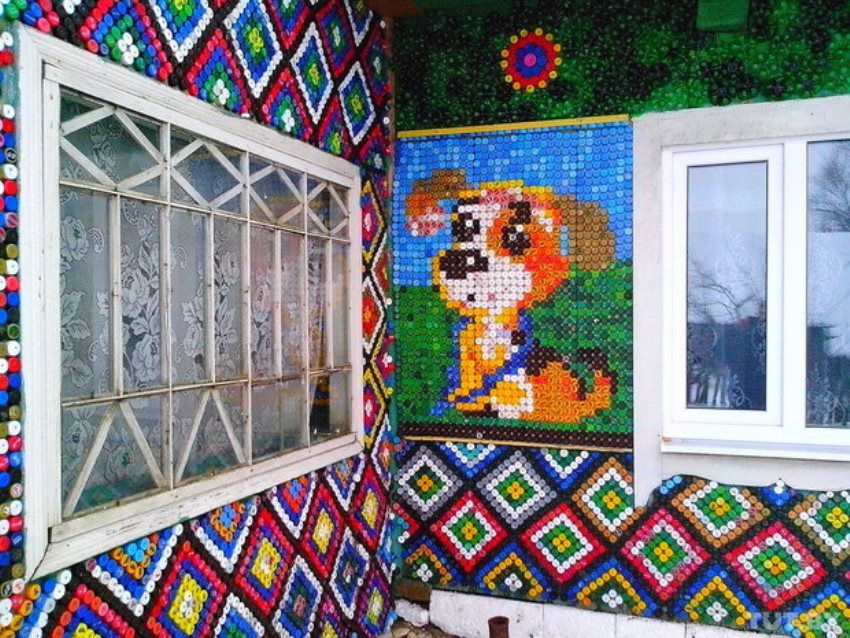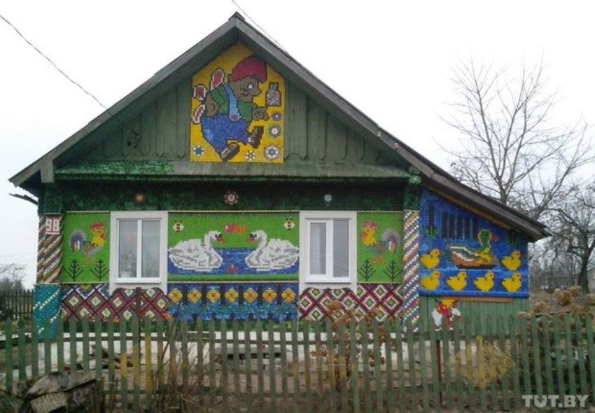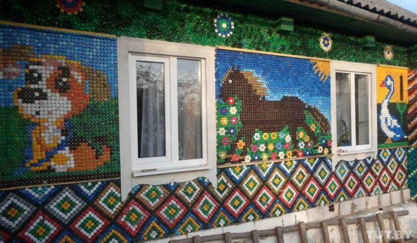 Мозайка на доме. Из 25 тысяч пробок семья в деревне Брильки выложила на своем доме рисунки животных, мультфильмы и символ ЧМ-2014 . Эта изба в деревне Брильки Воложинского района хорошо известна в округе. За пару месяцев дом семьи Алешко украсили композиции из нескольких тысяч пробок. Материал для работы собирается повсюду: от школ и больниц до соседей.