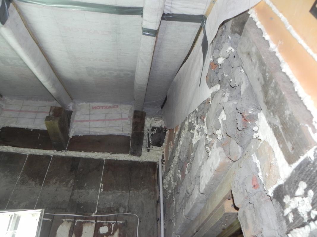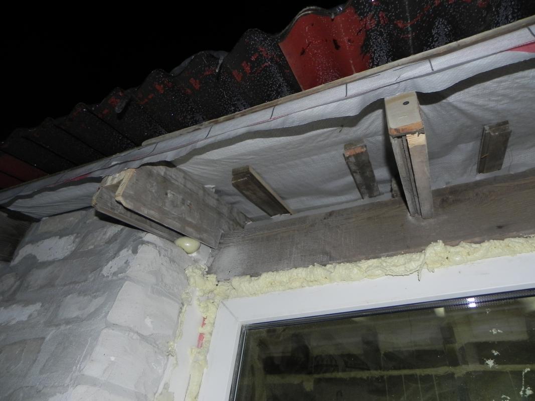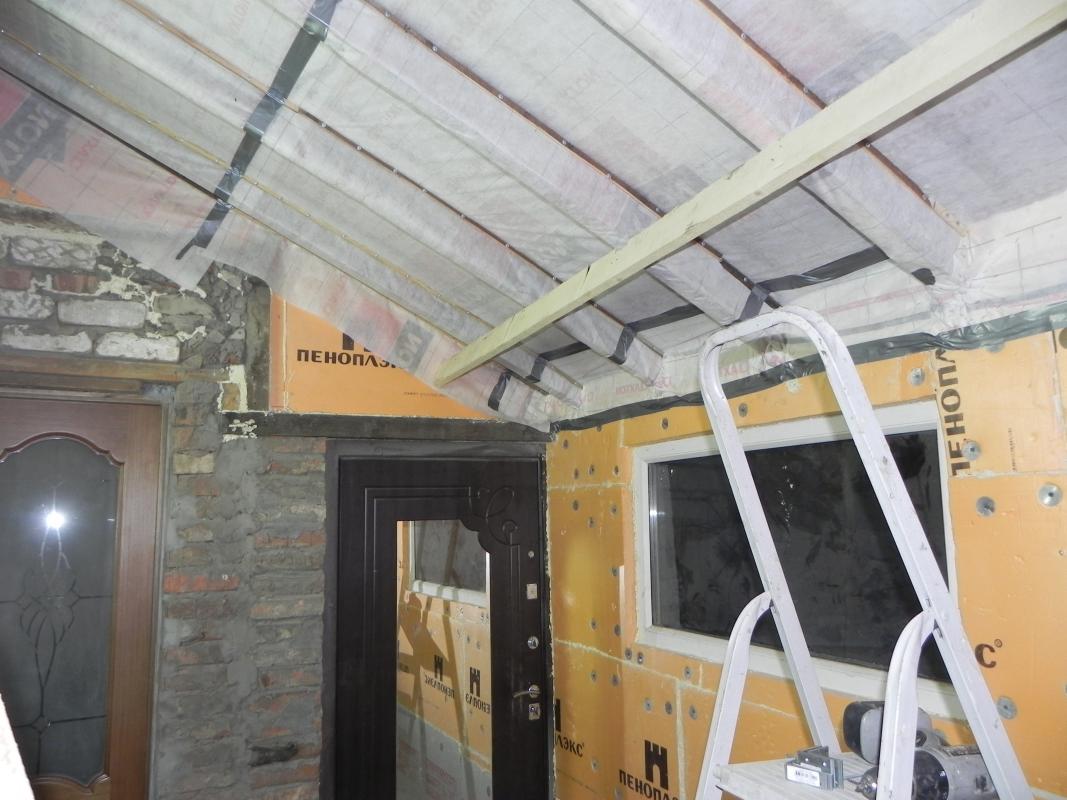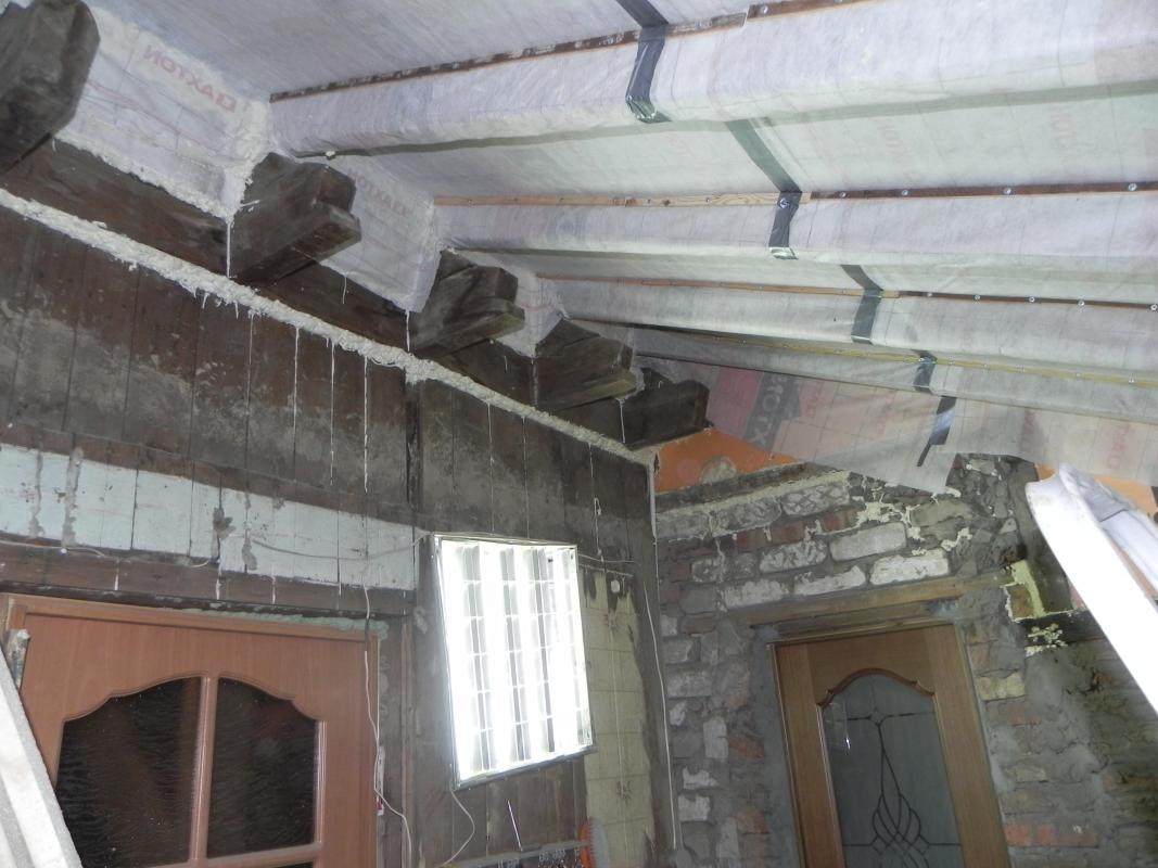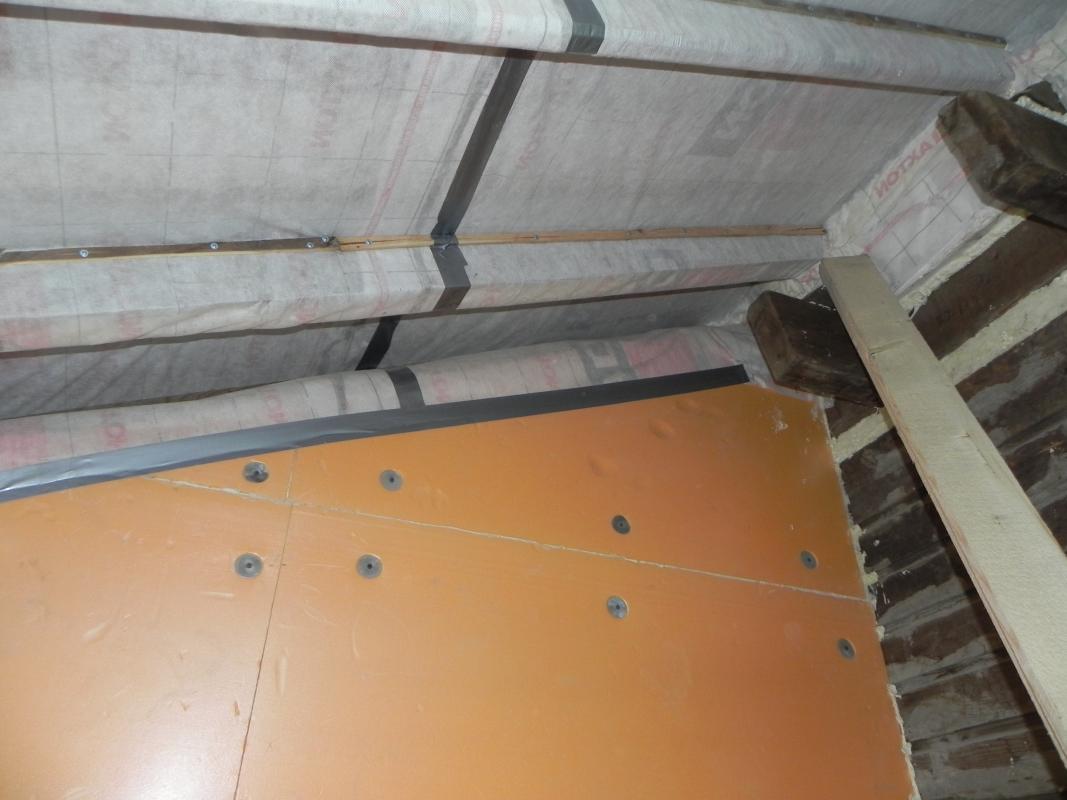 Слои проклеил двусторонним скотчем изоспан SL, что то вроде кровельного герметика, сверху скотчем кровельным. Гидроизоляцию прилеплял на пену монтажную и фиксировал степлером. С одной стороны не хватило гидроизоляции, добавлял. Помещение трапецивидное, так уж получилось. Там, где указывали стрелкой пустота, запенил. Там сбита стропила из подручных досок. На последней фото как раз видна в разрез самодельная стропила