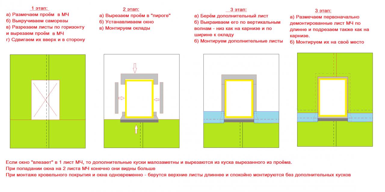 Neewel, ну тут проста так получилось... если б окно установили чуть ниже, то пришлось бы листы перехлестывать на волну ниже... точнее окно мог оказаться или выше или ниже этой линии. тогда перехлест на лишнию волну. и эту "волну"на двух листах на каждое окно закладываю заранее, когда материал считаем. потому как не знаешь куда окно врежется. а если на готовую кровлю врезать окно, то может понадобится по две волны на каждую сторону. |