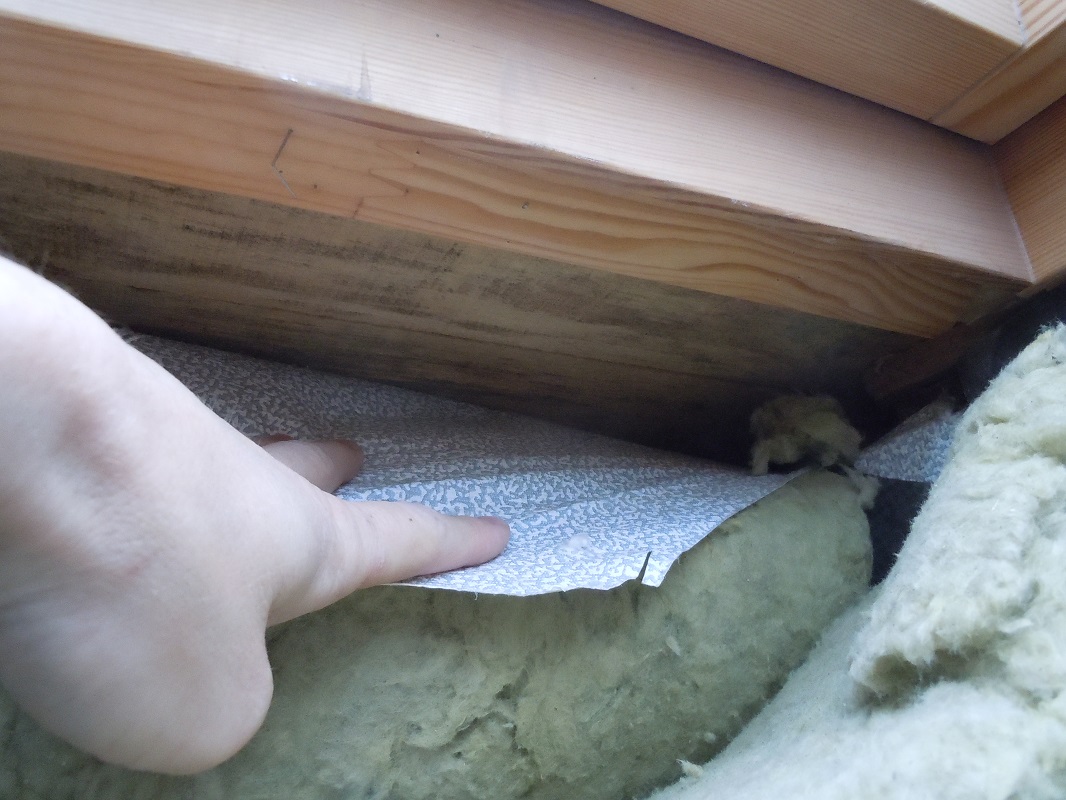 Теперь по наклонной стенке (скосу) нужно демонтировать гипсокартон с подсистемой , демонтировать пароизоляцию ,проверить качество монтажа теплоизоляции ,при необходимости добавить способом поперечного утепления ,снова смонтировать пароизоляцию с проклейкой полотнищ между собой и проклейкой примыкания к стенам специальным клеем . И будет вам счастье .
