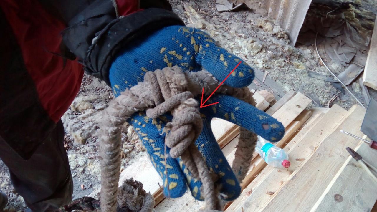 Самое простое - как в первом посте. Делаете 2 петли - с одного края маленькая, под карабин, с другого большая(ориентируясь на толщину веревки). Без нагрузок - свободно перемещается по веревке, даете усилие - затягивается. Ну это по крыше лазить нормально. Нашел уже перетертый - обернул сфоткал
