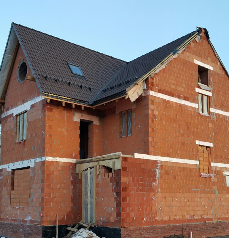 Смета составлена таким образом , что облицовочный кирпич завозится к началу облицовки ,а это апрель. Когда дошли до кровли, они поняли что надо выводить трубы из облицовочного кирпича. В принципе на тот момент я уже понял, что облицовку с этой фирмой я делать точно не буду и завез кирпич сам. Но делать трубные проходы (трубы) в минус 20 из клинкерного кирпича с белым швом, и еще это все доверить данным исполнителям я не решился. Кирпичные открытые шахты под камин и под отопление выложены и закачиваются сейчас под кровлей. Вентиляционная труба под три вентстояка и стояк канализации вообще еще не делалась , так как нет пока грамотного решения. В проект сделан под грамотного строителя. К сожалению я таким не являюсь, вот и понадеялся на фирму, но когда слышу их технологические решения понимаю, что так делать нельзя точно. Эту третью трубу пранирую выполнить из кирпича , вот только вопрос можно ли её ставить прямо на плиту перекрытия. Как вариант каркаса конструкция из фиброплит.