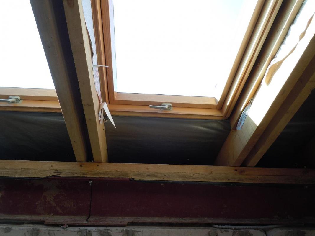 Вот еще общий вид. Правда, между стропилами уже заложил ватой. Щель толщиной около 1см плюс минус пара мм гуляет по всей ширине комнаты.