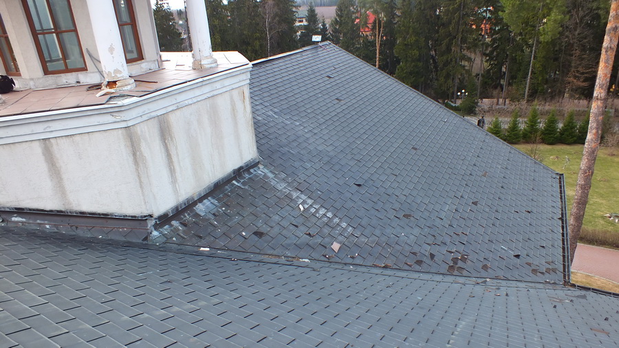 На днях провели визуальное обследование кровли с медной фольгой Тегола в одном из коттеджных поселков на рублевских землях Московской губернии. Площадь кровли 1500 м2. Со слов заказчика кровля простояла 10 лет (поселок строился в 2006 году). Снежки тоже легли. Комментарии излишне!