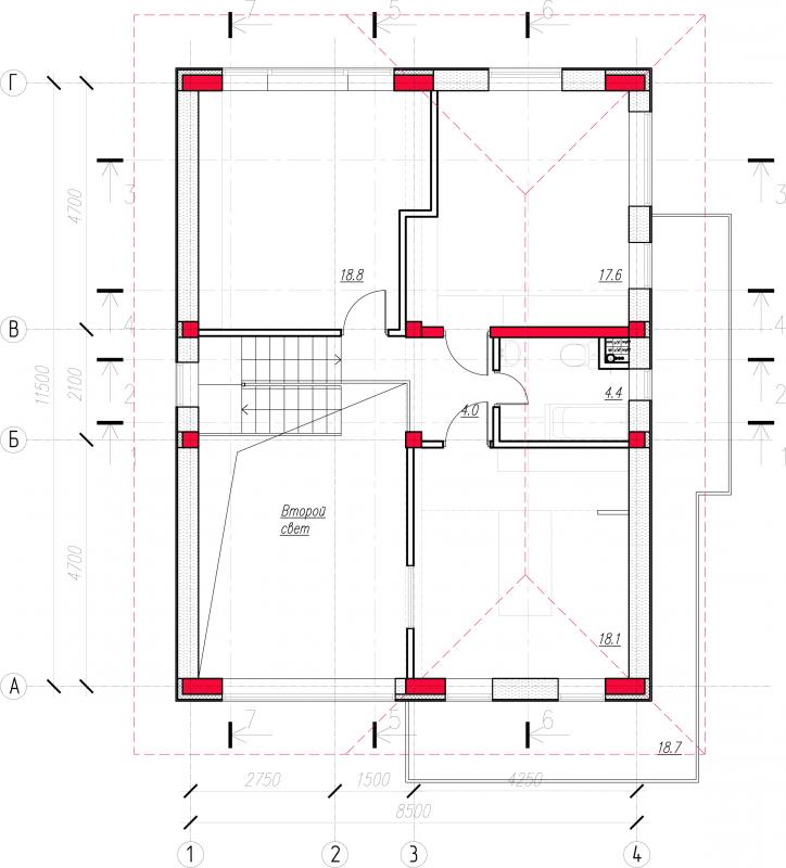 Конечно, все есть, а какие чертежи стоит выложить? Выкладываю план 2-го этажа, ж/б каркас выделен красным цветом. И для наглядности - весь ж/б каркас в 3д. Нужны ли остальные планировки и разрезы? Опалубочные чертежи?