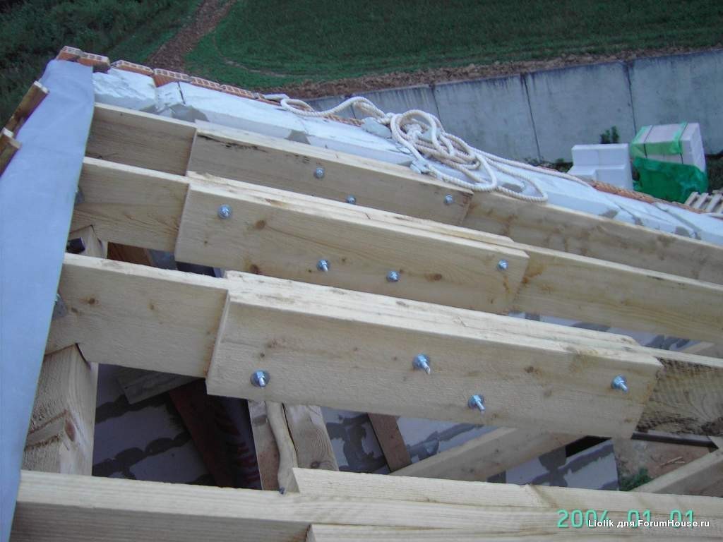 Вот, например, не понимаю, как лучше срастить стропила. По длинному скату стропильные ноги получаются больше 8 м длиной, брус можно купить только до 6 м. Сращивать рекомендуют в зоне опирания. В интернете я нашла картинку, как сращивают стропила с помощью накладок с двух сторон. Но как раз в зоне опирания будут находиться затяжки. Как быть? Крепить затяжки к накладкам? Или поднимать затяжки?