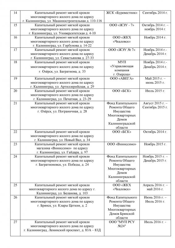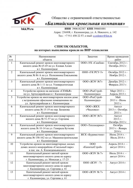 Список объектов, выполненных ООО "Балтийская Кровельная Компания" с применением ВИР-технологии.