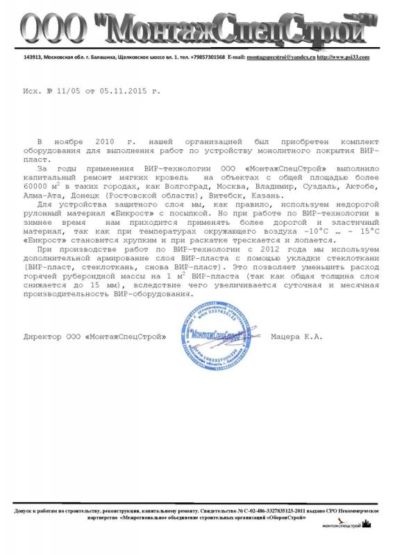 ВИР-технология капитального ремонта мягких кровель от ООО «ИнэкоВИР» · Полная себестоимость капремонта мягкой кровли даже в Москве не превышает 500 рублей за 1 квадратный метр, а реальная стоимость данного вида работ для заказчика ремонта (по опыту компаний, которые приобрели у нас ВИР-оборудование и успешно им работают) – 1200-1550 рублей за 1 квадратный метр и выше; · Не требуется замена утеплителя и стяжки, то есть одинаково легко ремонтируются кровли в любом состоянии, что позволяет экономить значительные средства без потери качества и снижения надёжности, а так же снизить количество простоев из-за дополнительных (скрытых) работ; · Капремонт мягкой кровли по ВИР-технологии можно проводить в любое время года и практически в любую погоду, за исключением сильных осадков, что даёт возможность брать и выполнять заказы круглый год (в то время как ремонт кровли с применением рулонных наплавляемых материалов может производиться в среднем 7 месяцев в году в зависимости от региона); · Материал ВИР-пласт является армированным и монолитным, легко выдерживает эксплуатацию как в экстремально холодных районах Сибири и Крайнего Севера, так и в жарких южных регионах и странах; он устойчив к перепадам температур и избыточной влажности воздуха, имеет высокие прочностные характеристики, что позволяет предоставлять заказчику гарантию на выполненную кровлю от 12 лет и выше (при неукоснительном соблюдении требований технологической карты и СНиП); · Технология является безотходной, так как весь старый кровельный ковёр снимается и идёт в переработку, а это особенно важно в связи с тем, что свалки ТБО не принимают битумные отходы мягких кровель, поэтому их приходится выбрасывать в лес, что является незаконным, либо сдавать на спецполигоны за большие деньги (в тех регионах, где они имеются); · На данный вид работ ООО «Инэковир» были получены федеральные расценки (ФЕР и ГЭСН), что значительно упрощает получение объёмов на муниципальных и государственных заказах, победу в конкурсах и тендерах (через сайт госзакупок и региональные фонды капитального ремонта многоквартирных домов); при этом в ряде регионов после выполнения экспериментальной кровли администрация старается отдать под ВИР-технологию максимально возможное количество кровель, обеспечив владельцев оборудования объёмами работ на долгие годы; · Технология ВИР уже работает во многих регионах, некоторые из наших клиентов готовы провести практическую демонстрацию реальной работы оборудования и технологии на своих объектах, а так же поделиться опытом получения объёмов и ведения данного бизнеса вообще. Ремонт мягкой кровли по ВИР-технологии в зимних условиях при отрицательных температурах можно прямо сейчас в Брянске (там работает ООО "БКК"). · С июля 2016 года ООО "ИНЭКОВИР" предоставляет своим клиентам и партнёрам гарантированные объёмы мягких кровель многоквартирных жилых домов под ВИР-технологию в Центральном Федеральном Округе (в Брянской области и не только). Важно подчеркнуть, что кровель хватит на всех желающих работать по ВИР-технологии и получать на этом высокую прибыль, качественно ремонтируя мягкие кровли. |