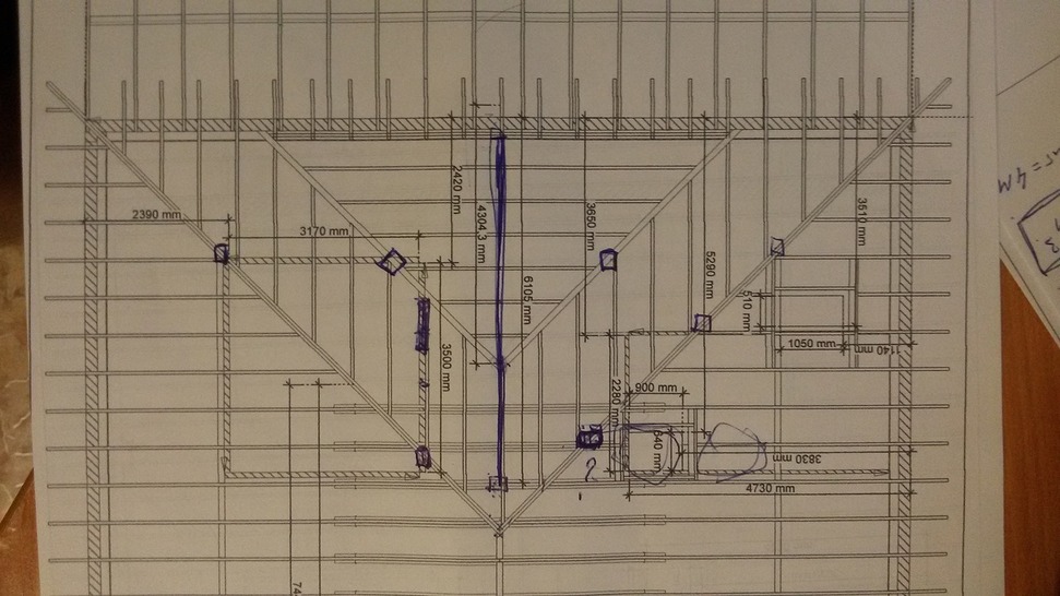 План второго этажа (он же мансарды). И план стропильной конструкции. На нем синими квадратиками обозначены места стоек под хребтовые и ендовые ноги. Коньковый прогон (6 м.п) слухового окна будет из двух сваренных 180 швеллеров в квадрат. Одной стойкой будет опираться перед мауэрлатом а вторая стойка (замаскируется) в среднюю стену. (стены каркасные на втором этаже)