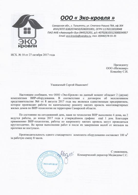 В конце октября 2017 в Самарской области Группа Компаний "Инэковир" проведёт научно-практическую конференцию по ВИР-технологии, на которой Вы сможете увидеть весь процесс капитального ремонта мягкой кровли на оборудовании образца 2017 года. Данное мероприятие будет проводиться с участием нашего клиента из Тольятти, который в этом году приобрёл два комплекта ВИР-оборудования и успешно его применяет.