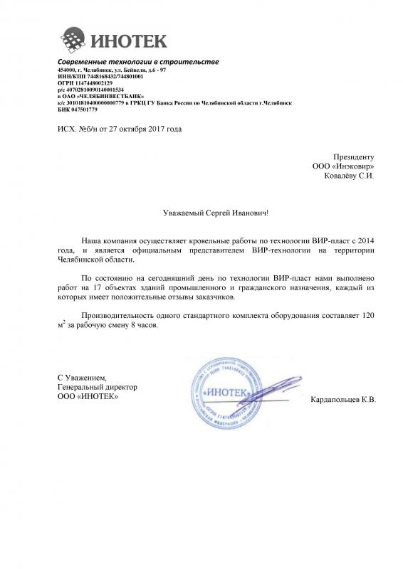 Получили новый отзыв от предприятия, работающего по ВИР-технологии в Челябинске.