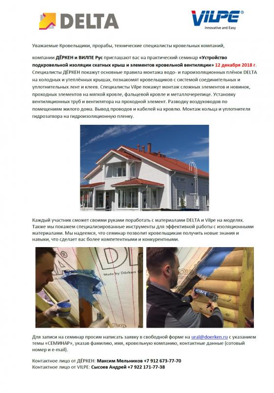 Компании ДЁРКЕН, ФАКРО и ВИЛПЕ приглашают кровельщиков на практические семинары «Устройство подкровельной изоляции скатных крыш, монтаж мансардных окон и систем кровельной вентиляции» 11 декабря (ДЁРКЕН + ФАКРО), 12 декабря (ДЁРКЕН + ВИЛПЕ) в Екатеринбурге и 13 декабря в Казани (ДЁРКЕН + ФАКРО).