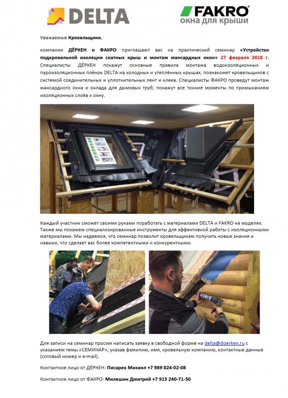 Уважаемые Кровельщики, компании ДЁРКЕН и ФАКРО приглашают вас на практический семинар «Устройство подкровельной изоляции скатных крыш и монтаж мансардных окон» 12 декабря 2017 г. Специалисты ДЁРКЕН: