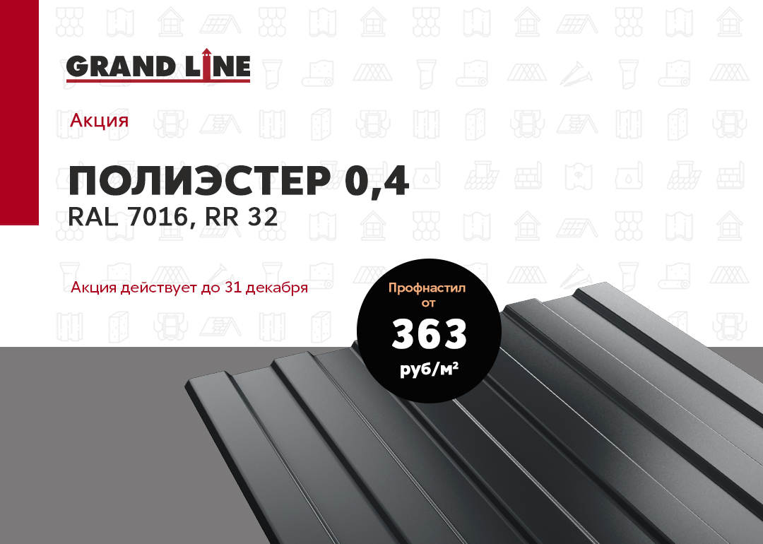 С 5 декабря действует специальное предложение на Полиэстер 0,4 RAL 7016, RR 32! В рамках акции на 15% снижены розничные цены на профилированную продукцию. Например, профнастил С8 в покрытии PE 0,4 всего за 363 руб./м² Акция действует до 31 декабря. *цены могут отличаться в зависимости от региона. Точную цену необходимо уточнять в интернет-магазине |